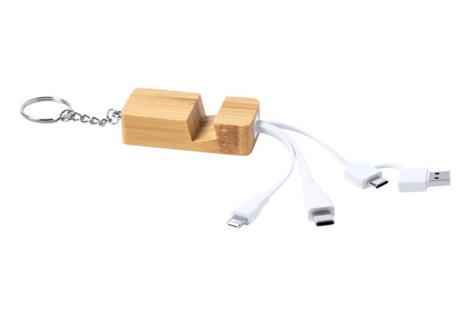 Suport mobil pentru breloc din bambus și cablu de încărcare USB cu conectori micro USB, USB-C și Lightning. Cu intrări USB și USB-C