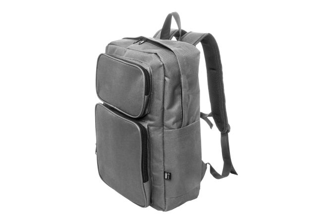 Rucsac RPET, cu compartiment principal cu fermoar, buzunar frontal cu fermoar, spateși bretele de umăr căptușite. Poliester 600D RPET, cu etichetă distinctivă RPET.