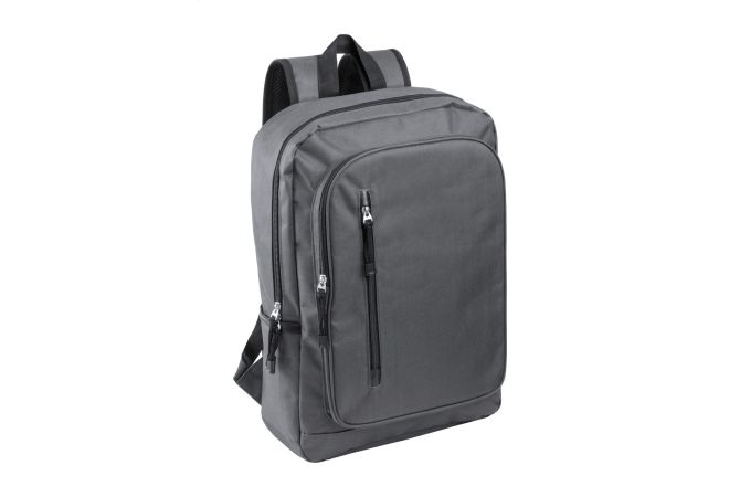 Rucsac RPET cu compartiment principal cu fermoar, 2 buzunare frontale cu fermoar, buzunare laterale si compartiment căptușit pentru laptop (15'). Cu spate și bretele căptușite. Poliester 600D RPET, cu etichetă distinctă RPET.