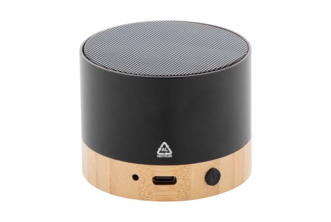 Difuzor bluetooth, din aluminiu reciclat, cu bază din bambus. Cu funcție de apel hands-free și baterie reîncărcabilă încorporată. Inclusiv cablu de încărcare USB.