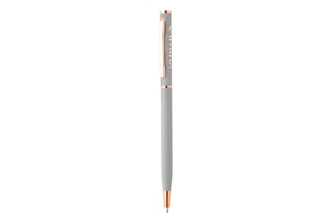 Pix din aluminiu reciclat, cu finisaj cauciucat și detalii auriu roz. Cu acoperire specială pentru gravarea laser în oglindă în culoarea aur roz. Cu mină albastră.