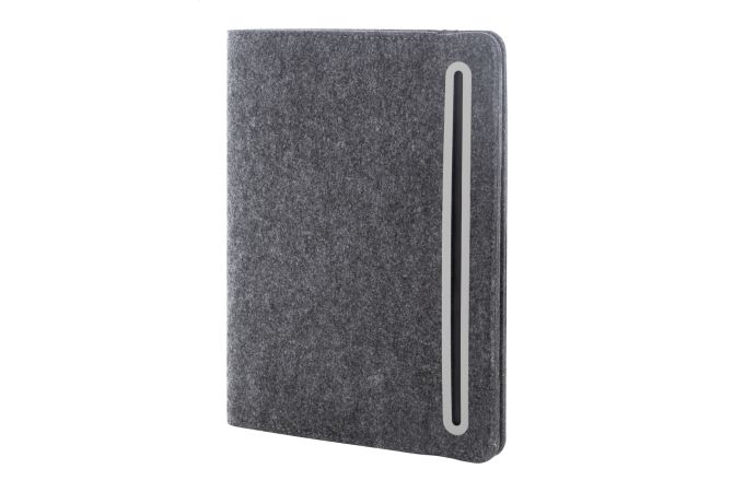Dosar pentru documente de dimensiune A5, din pâslă RPET, cu buzunare de organizare frontale și multiple interioare. Cu blocnotes cu 20 de foi dictando din hârtie reciclată.