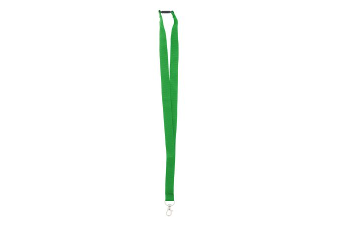 Lanyard din poliester RPET, cu carabină metalică și cataramă de siguranță.